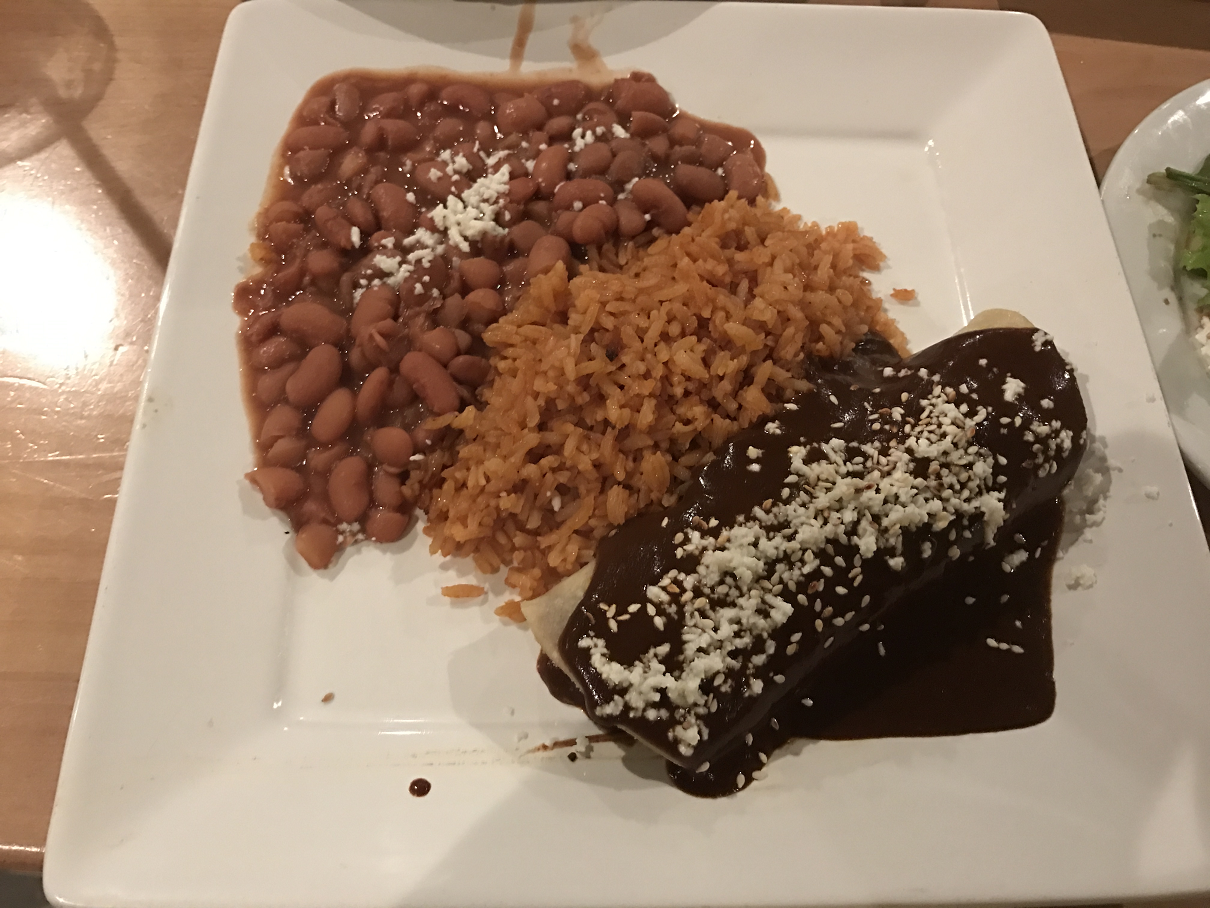 Came here in the middle of the week for dinner. Ordered chips and salsa for apps. You can tell they're made fresh; they came out hot! I normally can't finish my entire plate when I go out to eat, but the chicken mole enchilada was so good I ate every. last. bit.